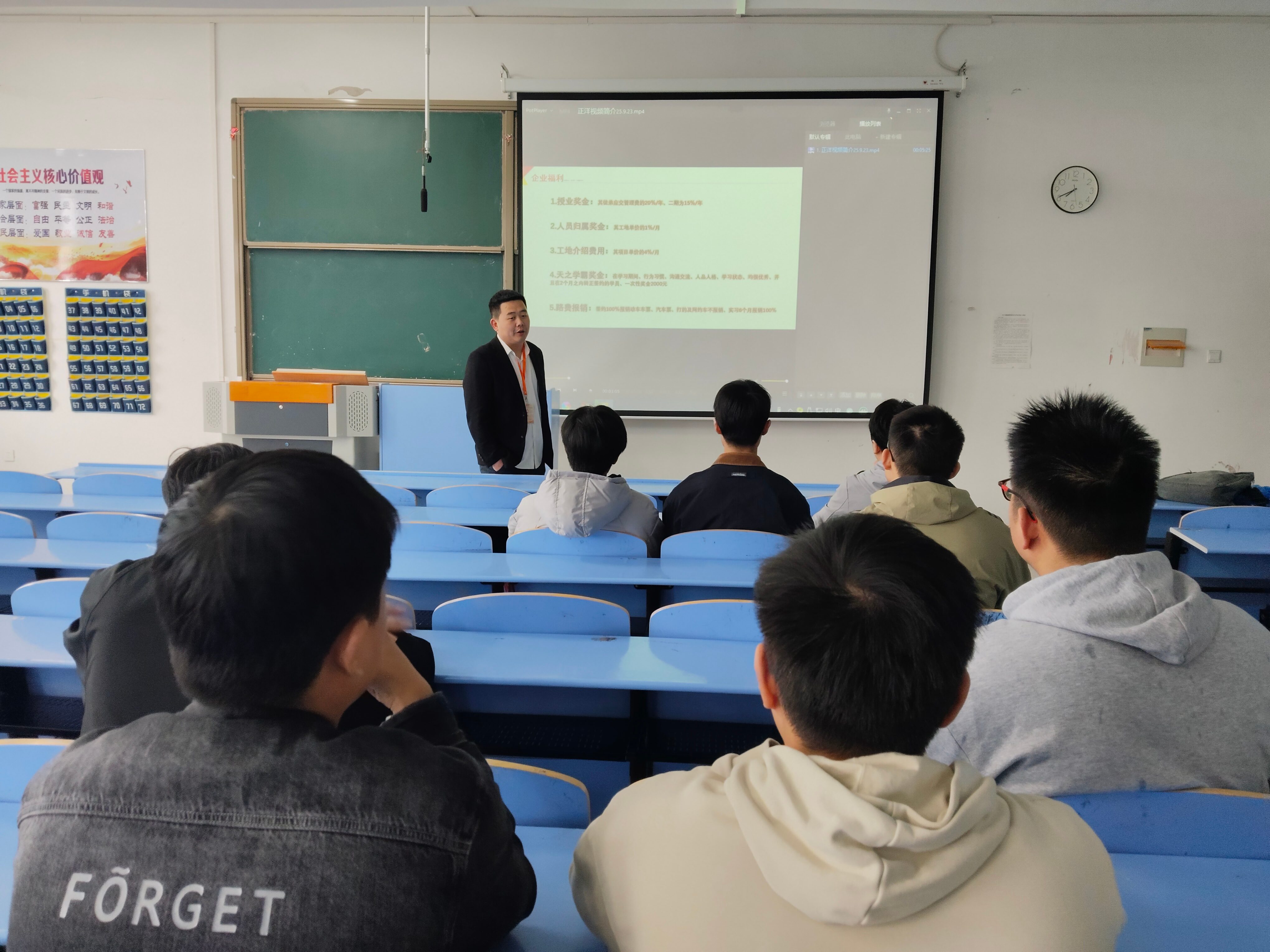 上午学校招聘会结束之后,中午12点,正洋工程有限公司招聘负责人在2301教室对招聘会有意向学生进行教室宣讲、现场面试等,与十余名学生达成初步就业意向。