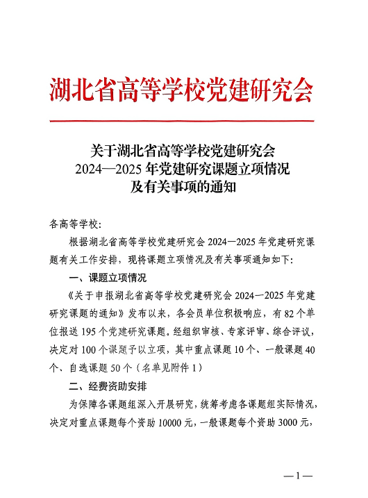 【喜讯】我校获批2024-2025年湖北省高等学校党建研究课题立项1项