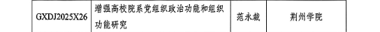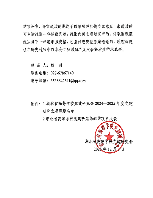 本网讯 近日,湖北省高等学校党建研究会公布2024-2025年度党建研究课题立项结果,我校党委委员、党务部部长范永裁主持的《增强高校院系党组织政治功能和组织功能研究》课题获批立项。