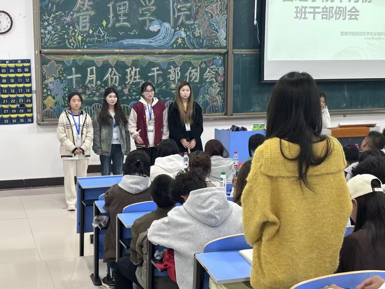 随后,各部门代表依次开展工作规划与班级评比细则说明。综合服务部部长尹钰婷率先解读了班级评比细则及加减分标准;学习部部长王书云讲解晚自习考勤纪律并介绍了“书香管院读书会”,鼓励大家积极参与学习活动;学风督导队队长杜倩细化查课管理规定;生活部部长吴可涵总结了查寝工作,还通过展示管理学院文明宿舍风采,号召全体成员共同营造安全卫生、文明和谐的寝室氛围。