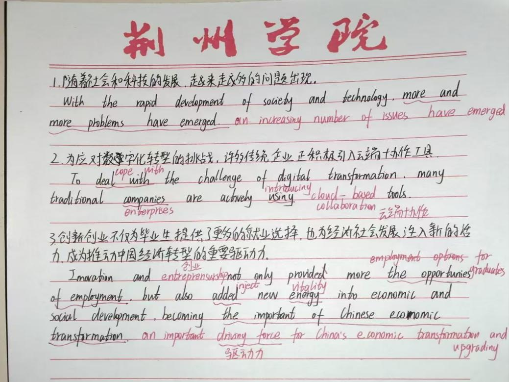 活动期间,学习部每日在活动群内推送一个四六级高频写作句型,内容涵盖数字经济、创新创业等热点主题,并附上参考译文,帮助同学们理解掌握。参与者通过“手写摘抄+线上提交”相结合的方式进行打卡,随后通过“接龙管家”小程序上传照片完成当日打卡记录。据统计,全程坚持打卡的同学占比超过八成,提交的打卡作品中不乏对句型的举一反三和个人化注解。许多同学反馈,通过十天有规律地积累,不仅掌握了大量实用表达,更缓解了对写作的畏难情绪,形成了主动学习、每日精进的习惯。