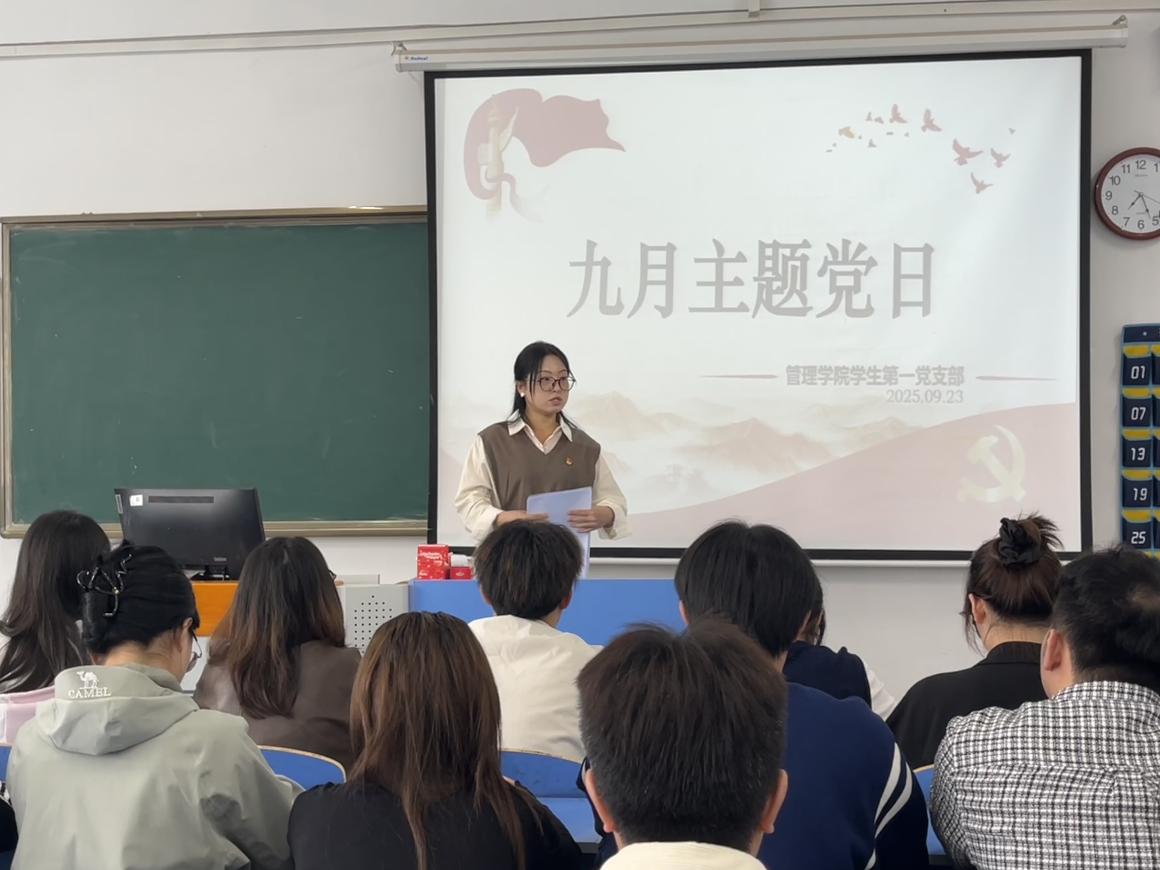 在政治学习后,管理学院第一、第二党支部开展了九月主题党日活动,会上先由党支部书记带领支部成员重温入党誓词、集体朗诵党章并组织党员交纳九月党费。随后党支部书记组织开展理论学习,重点学习了以下内容:(1)习近平:在纪念中国人民抗日战争暨世界反法西斯战争胜利80周年大会上的讲话(2)《求是》杂志发表习近平总书记重要文章《弘扬伟大抗战精神,向着中华民族伟大复兴的光辉彼岸奋勇前进》(3)习近平给全国特岗教师代表的回信(4)习近平作出重要指示强调 锲而不舍落实中央八项规定精神 推进作风建设常态化长效化(5)湖北省委常委会扩大会议暨省委党的建设工作领导小组会议召开 锲而不舍落实中央八项规定精神 推进作风建设常态化长效化。