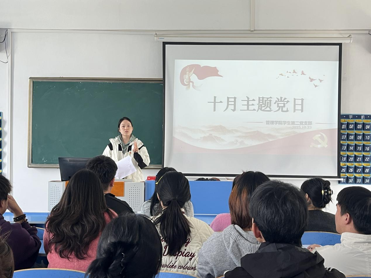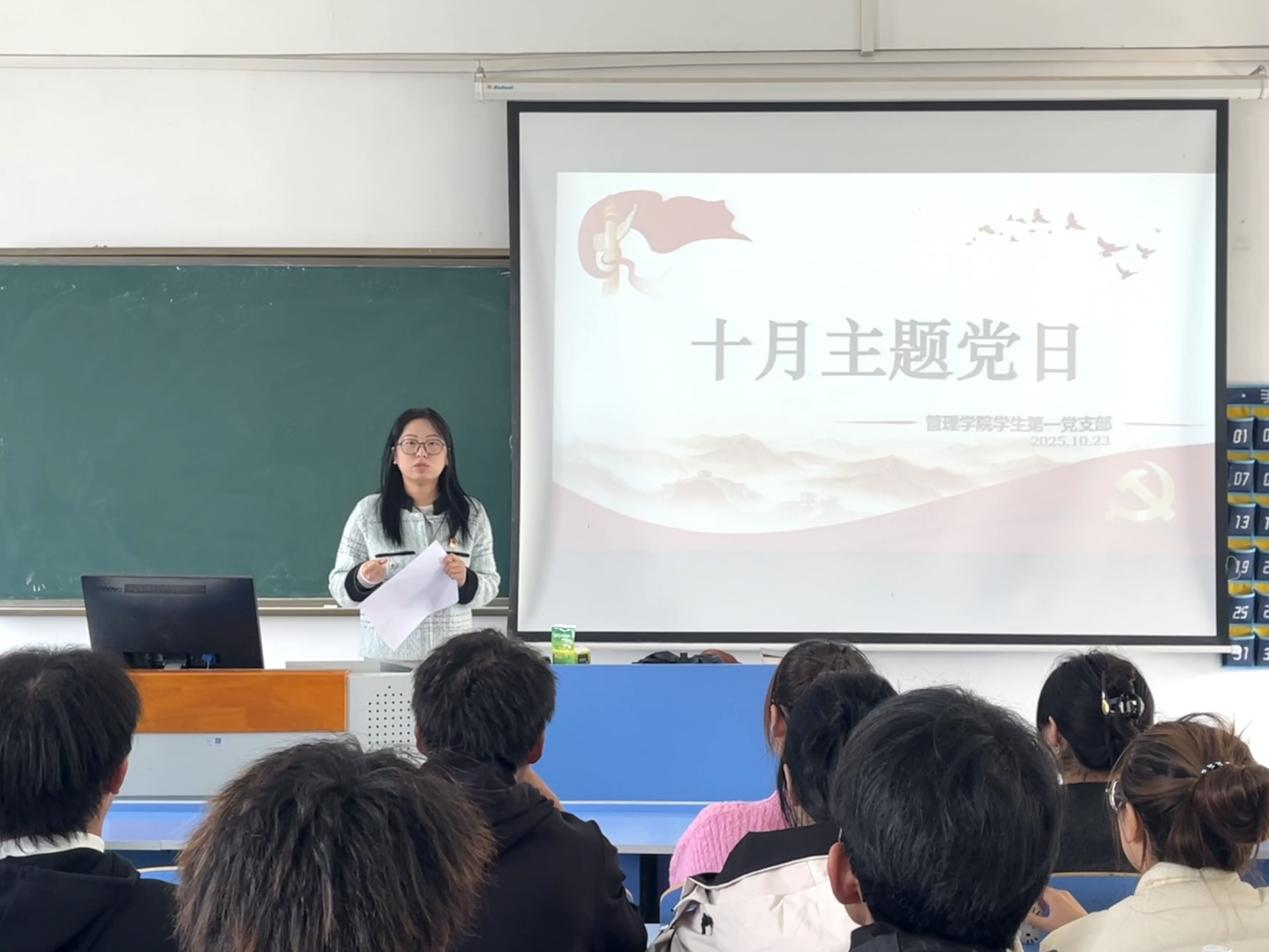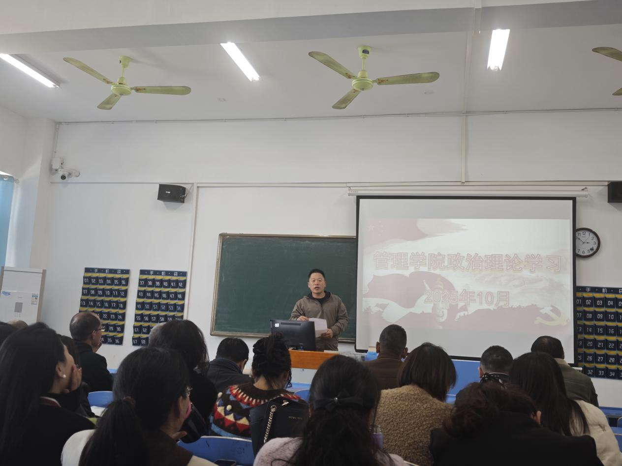 在政治学习后,管理学院第一、第二党支部开展了十月主题党日活动,会上先由党支部书记带领支部成员重温入党誓词、集体朗诵党章并组织党员交纳十月党费。随后党支部书记组织开展理论学习,重点学习了以下内容:(1)中共中央办公厅转发《中央宣传部、中央组织部关于认真组织学习〈习近平谈治国理政〉第五卷的通知》(2)庆祝中华人民共和国成立76周年招待会在京举行 习近平发表重要讲话(3)习近平:完整准确全面贯彻新时代党的治疆方略 努力建设团结和谐、繁荣富裕、文明进步、安居乐业、生态良好的社会主义现代化新疆(4)中共中央政治局召开会议 讨论拟提请二十届四中全会审议的文件 中共中央总书记习近平主持会议(5)习近平在中共中央政治局第二十二次集体学习时强调 系统推进我国宗教中国化 积极引导宗教与社会主义社会相适应(6)《求是》杂志发表习近平总书记重要文章《中华民族共同体的形成和发展是人心所向、大势所趋、历史必然》(7)中共湖北省委深入贯彻中央八项规定精神学习教育工作专班 中共湖北省纪委办公厅关于6起违反中央八项规定精神典型问题的通报。