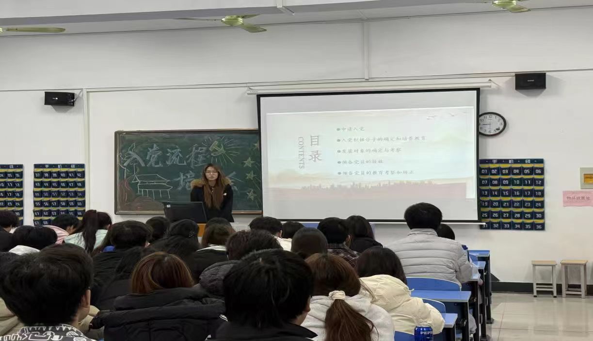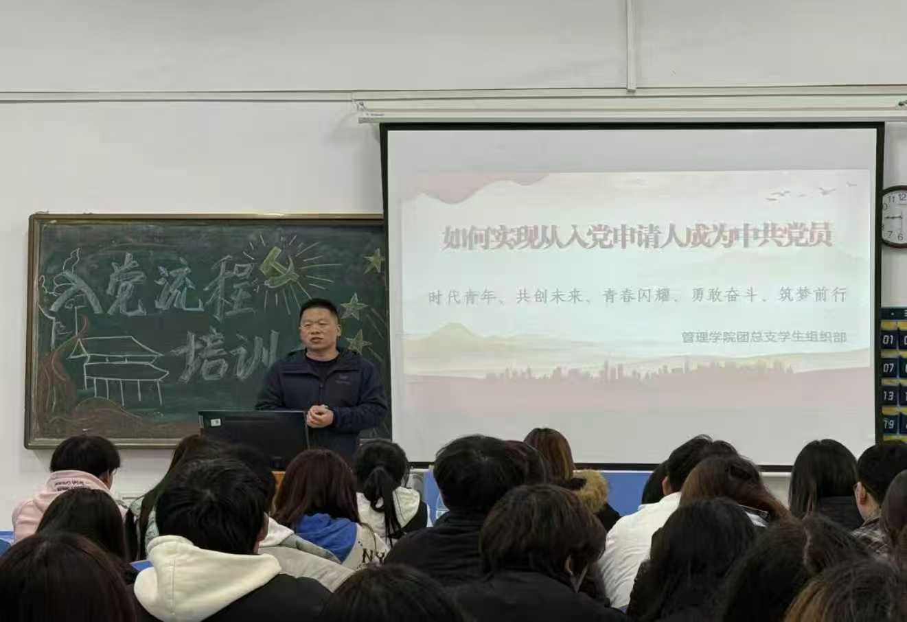 随后,管理学院团总支学生会组织部部长汪佳倩详细讲解了入党流程细则,内容包括申请入党、入党积极分子的确定与培养、发展对象的考察、预备党员的接收、预备党员的教育考察及转正等环节,并对入党申请书、思想汇报、入党志愿书等材料的撰写要点与格式规范作了说明。通过讲解,同学们对入党各环节有了更加清晰的认识。