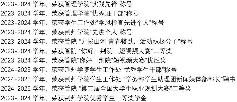 在学习上,在2023-2024学年,综测班级排名第一,荣获2023-2024学年荆州学院优秀学生一等奖学金。一直坚持学习为学生的第一要务,踏实认真、勤奋刻苦,努力学习专业知识。考取普通话证书,此外还在备战专升本,想要为自己创造更多的学习空间。