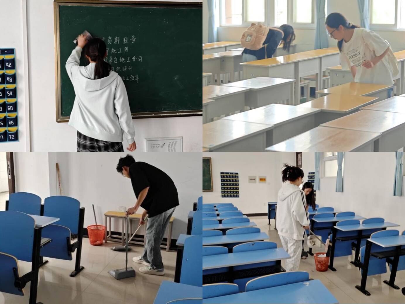 在教室内,同学们仔细整理桌椅、擦拭黑板,认真打扫各个角落并清理垃圾。大家都在各自的任务中默默付出,以实际行动展现着奉献的魅力,齐心协力为打造一个更为干净、宜人的教学场所而努力。