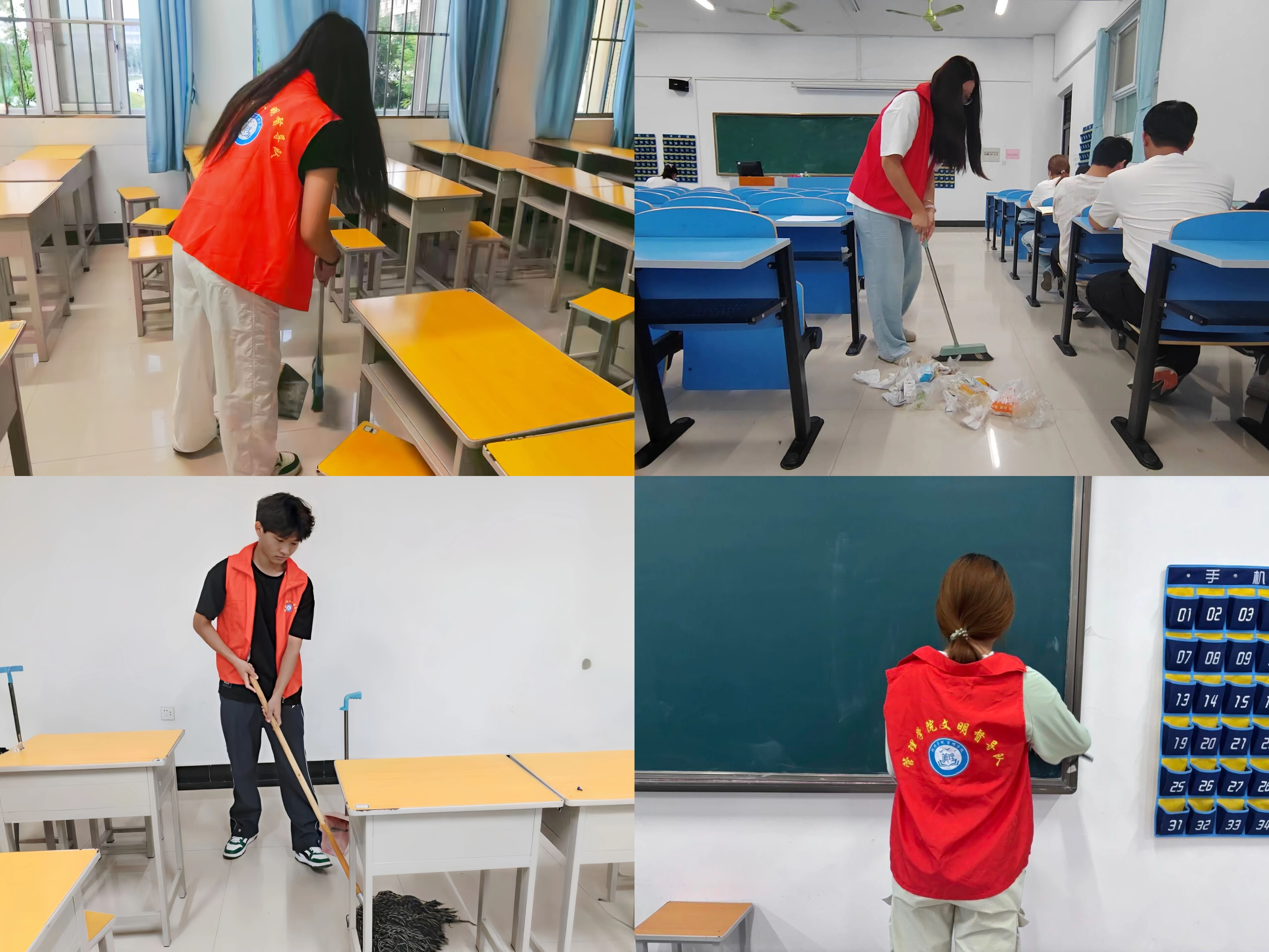 楼道与走廊区域,志愿者手持扫帚、捡物夹等工具,有序清扫地面,楼梯等区域的杂物。经过管院学子的共同努力,六栋教学楼内外环境更加整洁明亮,为师生营造了清新舒适的教学环境。