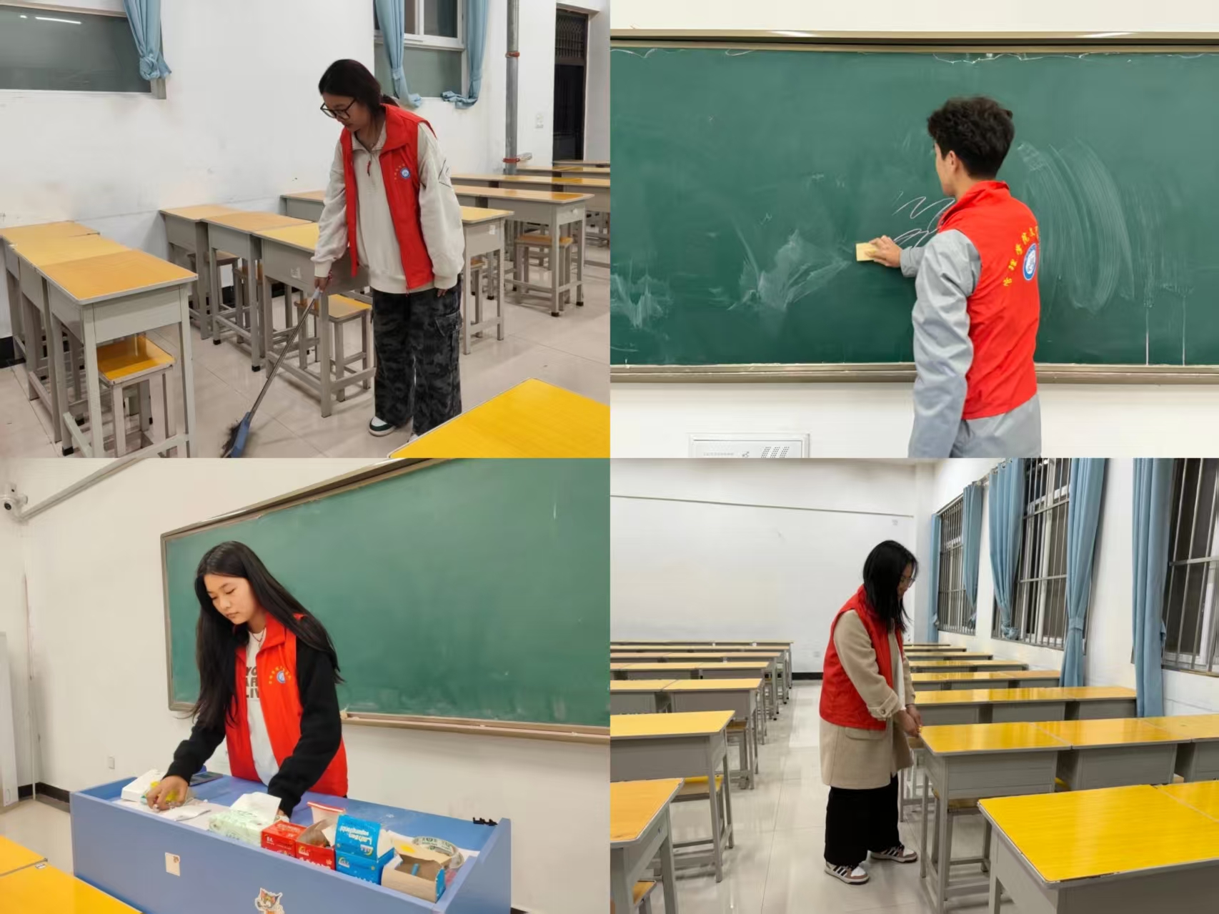 活动伊始,同学们集合于六栋教学楼,在负责人的带领下同学们迅速行动,到相应教室进行卫生清洁,用行动诠释绿色文明的真谛,争做文明校园的宣传者。活动中,同学们展现了他们的团队协助能力以及对保护环境的责任感,在教室内同学们擦拭着黑板,手持扫把仔细查找着每一张纸屑,彰显出同学们积极的态度。