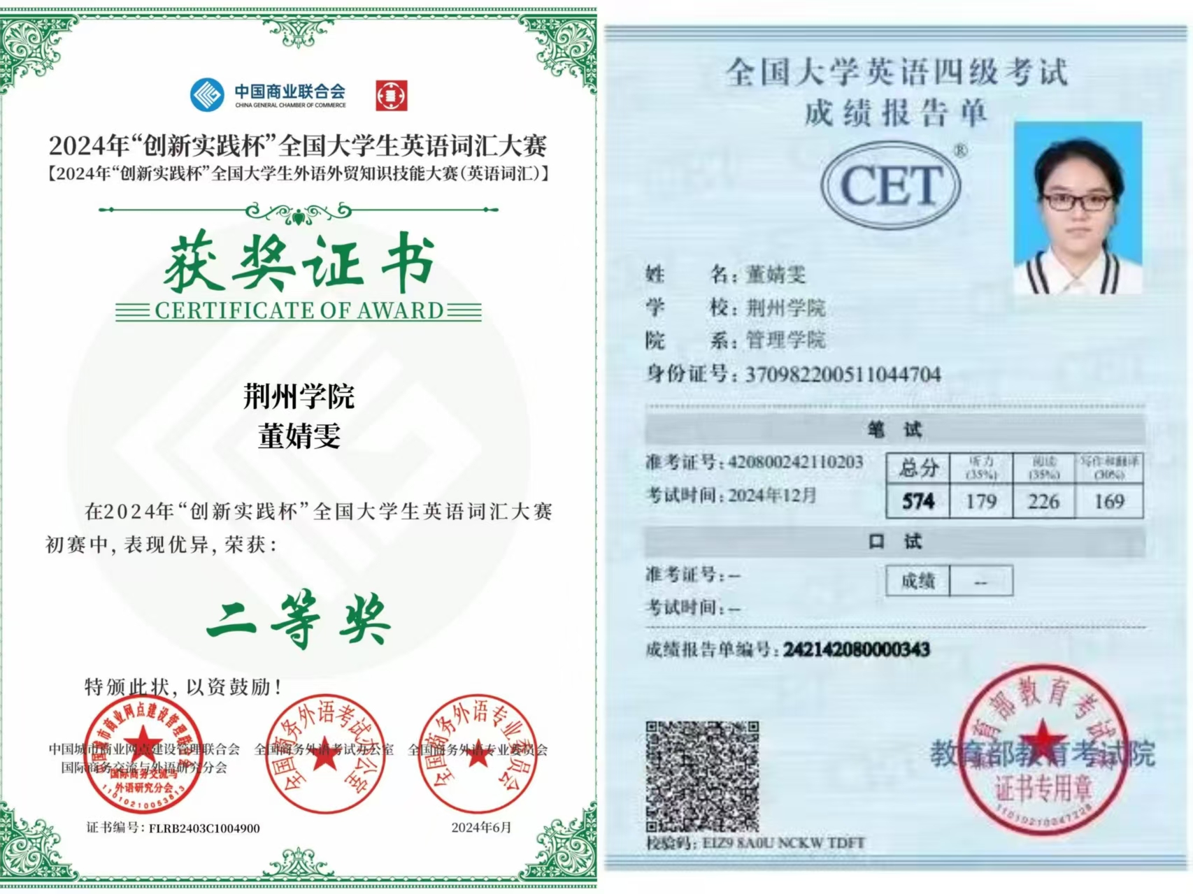 学业上持续领先,学业成绩第一,综测排名第二,荣获校级二等奖学金。竞赛中发挥语言优势,先后荣获“创新实践杯”全国大学生英语词汇大赛全国优秀奖、第三届“BETT杯”全国大学生英语词汇大赛全国二等奖、全国大学生英语翻译大赛省级三等奖、以及校级英语技能竞赛一等奖。此外,她还考取了英语四级、计算机二级、初级会计及普通话证书,以扎实积累促进学业与能力双向发展,展现出管院学子的优秀素养。