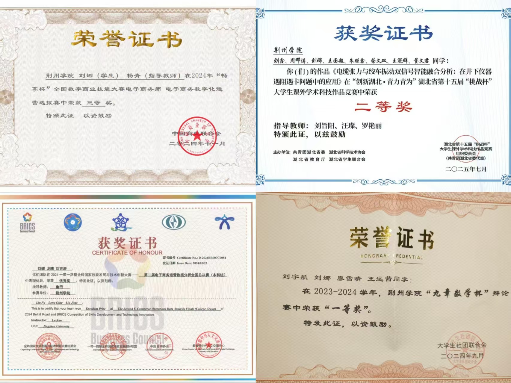 学业上认真勤勉,学业成绩与综合测评均排名班级第四。在竞赛中表现积极,荣获第五届全国数字贸易技能大赛全国总决赛三等奖、第十五届全国大学生电子商务“三创赛”荆州学院校级赛二等奖、校级数字贸易技能竞赛三等奖。他坚持以赛促学、以练促长,推动学业成绩与综合素质的共同进步,展现青年学子踏实进取的担当精神。