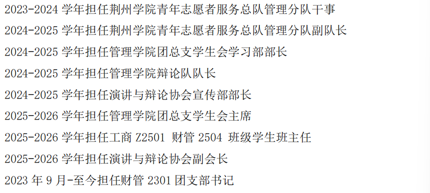 任职履历:曾任荆州学院青年志愿者服务总队管理分队干事、荆州学院青年志愿者服务总队管理分队副队长、管理学院团总支学生会学习部部长、管理学院辩论队队长、演讲与辩论协会宣传部部长,现任管理学院团总支学生会主席、工商Z2501、财管2504 班学生班主任、演讲与辩论协会副会长、财管2301团支部书记。