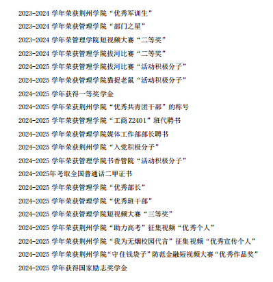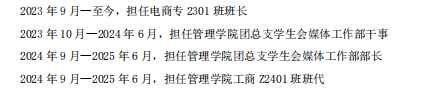 任职履历:曾任管理学院团总支学生会媒体工作部干事、管理学院团总支学生会媒体工作部部长、管理学院工商Z2401班班代,现任电商专2301班班长。