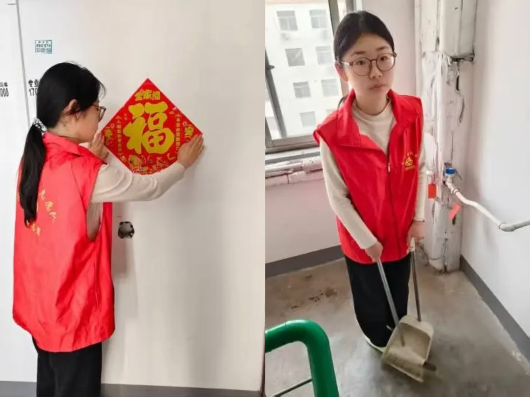 我跟随居委会工作人员,手持扫帚、簸箕,沿着居民楼楼梯逐层打扫,清理角落烟蒂、台阶纸屑、转角灰尘,让楼道环境焕然一新;随后,用抹布反复擦拭楼道窗户,让蒙尘的玻璃变得透亮,满满的成就感油然而生。打扫完毕后,与其他志愿者一起在墙上贴福贴,抚平福字边角的瞬间,红彤彤的色彩为社区添满年味,仿佛将新年的美好祝福送到了每一户人家。