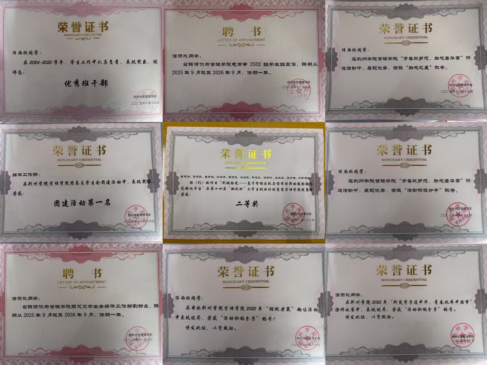 自入学以来,任雨欣同学始终以严谨认真的态度对待学习和各项事务,从班级建设、团学工作到参加各类校园活动,她用实际行动诠释着青年学子的责任与担当。在学生工作中,任雨欣展现出突出的组织协调能力和责任意识。刚进校园,她就主动加入管理学院团总支学生会组织部,凭借踏实肯干的作风快速适应工作节奏,成为团队里的得力帮手。后凭借出色的工作表现晋升为媒体工作部副部长,同时肩负起电商专2502班学生班主任的职责,此外还自2024年起一直担任电商专2401班班长,身兼数职却始终有条不紊。作为班长,她心系班级同学,积极搭建师生沟通桥梁,组织各类班级活动增强集体凝聚力;作为媒体工作部副部长,她带领团队做好校园活动宣传、新媒体运营等工作,用镜头和文字记录校园精彩;作为电商2502班学生班主任,她耐心指导新生适应大学生活,分享学习与工作经验,成为新生成长路上的引路人。在校园生活中,任雨欣同学也收获了诸多荣誉与认可。她以优良的作风和表现荣获“优秀军训生”称号;她积极参与公益活动,获得“用热血铸就生命,以爱心庆祝国庆”荣誉证书。同时她在班级管理中表现突出,被授予“优秀班干部”称号,并凭借优秀的参赛作品斩获“你好,荆院”短视频大赛三等奖。在各类校园活动中,她始终热情高涨,不仅获得“猫捉老鼠”趣味活动“活动积极分子”,还助力团队夺得“团建活动第一名”。此外她还获评“优秀志愿者”“活动积极分子”“优秀组织者”“励志之星”等荣誉。在专业能力与综合素质提升方面,她也从未停歇,2025年顺利考取普通话证书,同时在第十四届“挑战杯”大学生创业计划竞赛管理学院院赛中凭借优质项目荣获二等奖,充分展现了其创新思维与实践能力。任雨欣同学在工作中勇挑重担,在学习中勤学好问,在活动中积极进取。她用责任与担当书写青春答卷,用热情与坚持践行初心使命,是新时代大学生中全面发展、勇于担当的好榜样。相信在未来的人生道路上,她一定能继续发光发热,绽放更多精彩。