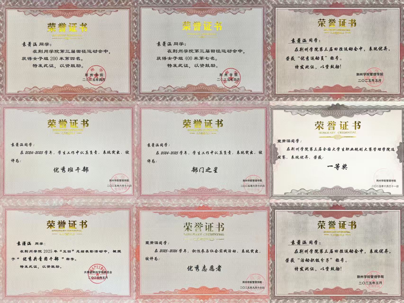 在校期间所获荣誉和奖励