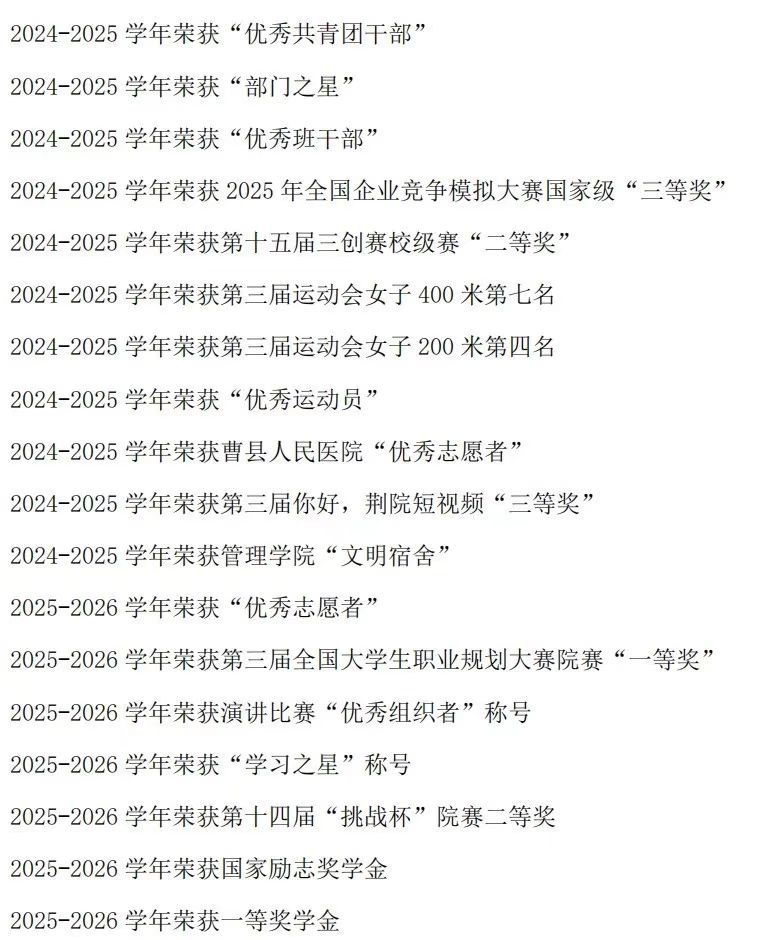 袁萧涵同学,以担当诠释青春底色,以勤学践行初心使命,始终在学习与工作的双赛道上奋力奔跑,以品学兼优的综合素养,展示出新时代青年学子的良好风貌。她始终将学业置于首位,在知识的海洋中破浪前行。面对繁重的学生工作,不仅专心学习筑牢学识根基,更斩获2025-2026学年国家励志奖学金与一等奖学金,获评“学习之星”。在学术竞赛的舞台上,她同样表现亮眼,凭借全国企业竞争模拟大赛国家级三等奖、“挑战杯”院赛二等奖等多项荣誉,生动诠释了“知行合一”的深刻内涵。在班级建设工作中,她身兼数职,从工商2402班军训负责人到现任团支书,再到工商2502班学生班主任,始终以高度的责任感扛起重任,用心搭建师生沟通的桥梁,全力凝聚集体向心力,凭借出色的组织协调能力和无私的奉献精神,荣获“优秀班干部”与“优秀共青团干部” 称号。在工作中,她从管理学院团总支学生会组织部干事稳步成长为现任副部长,凭借高效的执行力,荣获“部门之星”,并在“荆楚学子道中华,青春托举中国梦”演讲比赛中荣获“优秀组织者”称号,将服务的初心融入每一项工作细节之中。 赛场之上,她是挥洒汗水的运动健儿,在第三届运动会中夺得女子200米第四名、400米第七名,获评“优秀运动员”称号,尽显顽强拼搏的体育精神。志愿路上,她是传递温暖的践行者,累计荣获两次“优秀志愿者” 称号。此外,她在短视频大赛中获三等奖,并带领宿舍斩获“文明宿舍”,充分展现了全面发展的综合素质。青春因磨砺而出彩,人生因奋斗而升华。袁萧涵同学怀揣热忱奔赴热爱,秉持笃行迈向远方。她以拼搏浇灌梦想,用实干铸就荣光,在逐梦征程中步履不停,终将绽放更耀眼的芳华!