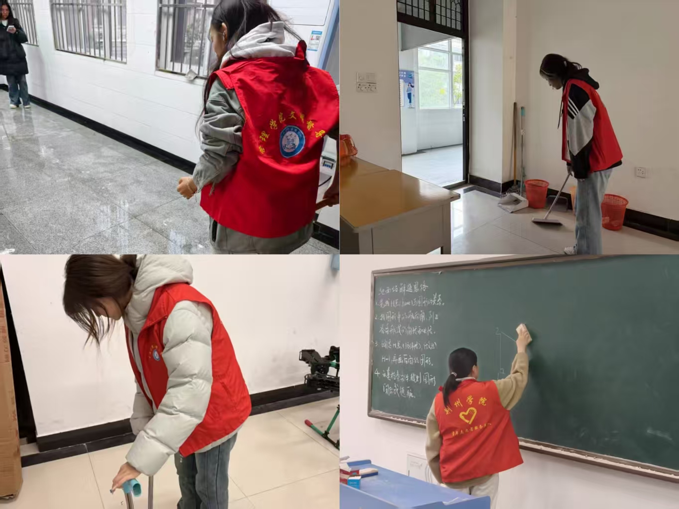 活动伊始,志愿者们准时在六栋教学楼前集结完毕。现场负责人根据清扫范围进行小组划分和区域分工,并说明工具摆放规范。各小组随后前往指定教室,清扫地面、擦拭黑板、讲台及窗台,将桌椅归位摆放整齐。经过同学们的劳动,六栋教学楼教室及走廊等公共区域的环境卫生得到有效改善。