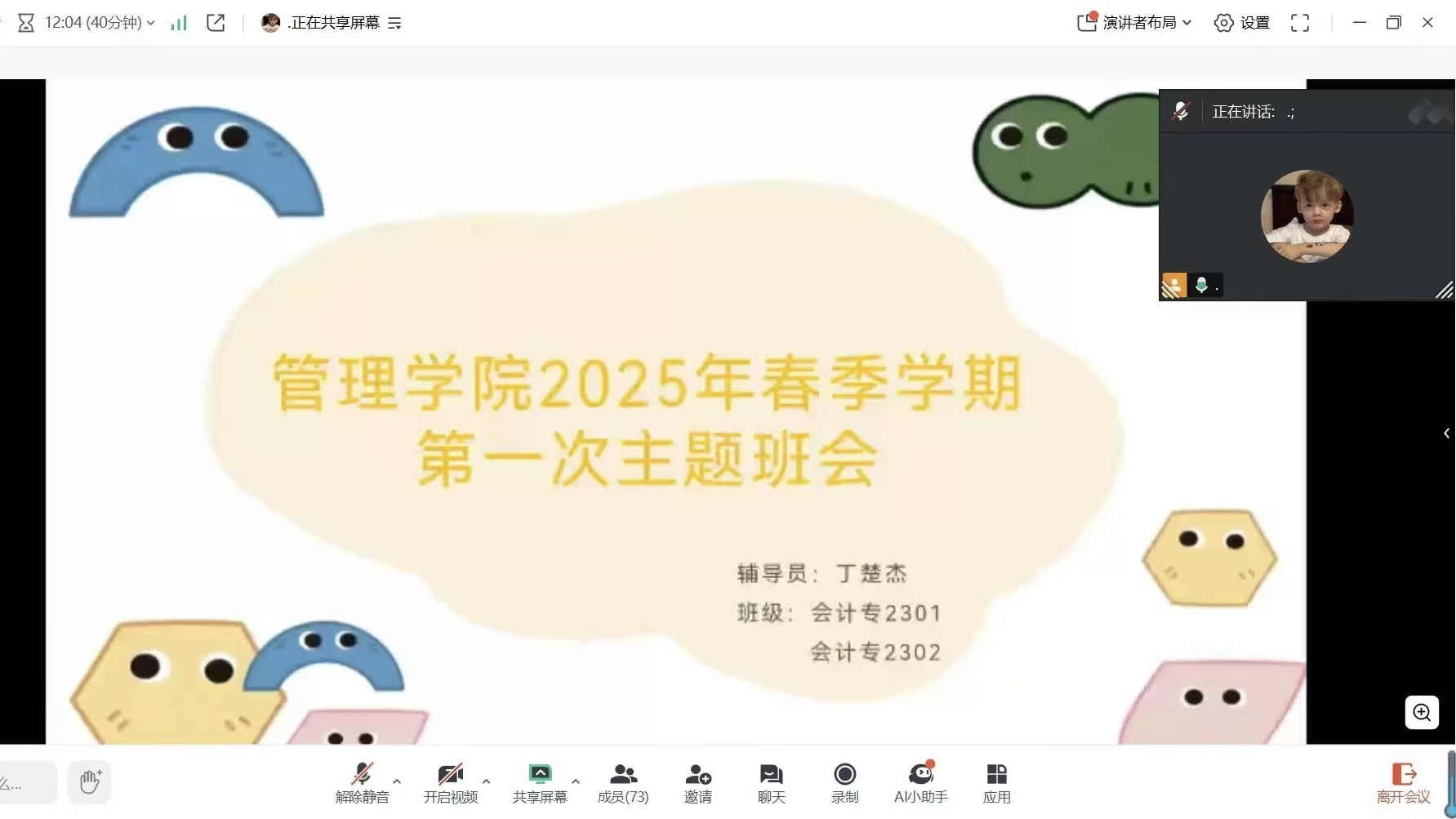 本网讯(通讯员:王奇名)为切实做好新学期学生教育管理工作,引导学生尽快适应学习生活节奏,强化安全意识与心理健康意识,以昂扬向上的精神面貌迎接新学期,管理学院各辅导员于2月20日-21日与所带班级以线上形式陆续开展2025年春季学期第一次主题班会。