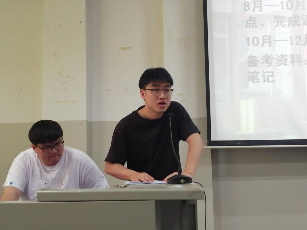 首先分享考研经验的是李钦学长,他讲述了自己考研的曲折过程,分享了个人学习经验和考研用书,并表示“在考研时要找对方法,坚定信念,想到就要去做,星光不会感动人”。第二位上台分享经验的是梅炎学长,他主要对科目复习时的一些小技巧进行了讲解,并对不同时间段各科的学习目标及方法作了简单介绍。柯婷学姐在分享中结合自身的经历,分享了避开弯路的措施,并表示对于英语的学习单词是根基,有助于给四六级考试作铺垫。最后一位上场分享经验的是赵甜学姐,她讲述了在备考时期的学习计划,主要以刷题、看网课来查缺补漏的学习途径。