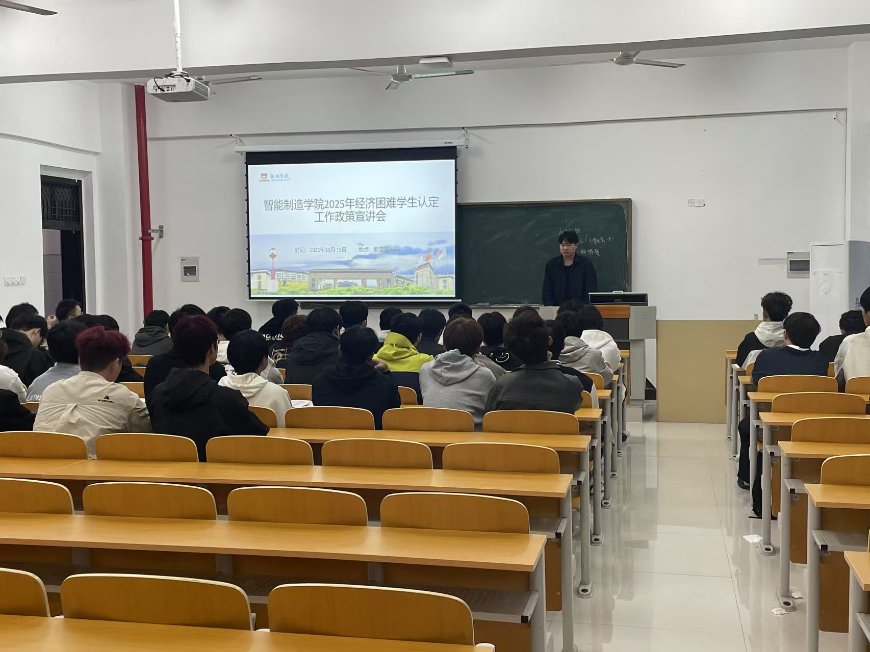 本网讯(通讯员 晏学渊)为确保国家资助政策精准落实,帮助家庭经济困难学生顺利完成学业,10月14日-16日,智能制造学院2025-2026学年贫困生认定工作正式启动。学院高度重视此项工作,积极部署,全面组织各班级召开贫困生认定工作政策宣讲班会,旨在让每一位学生深入了解政策,确保认定过程的公平、公正、公开。