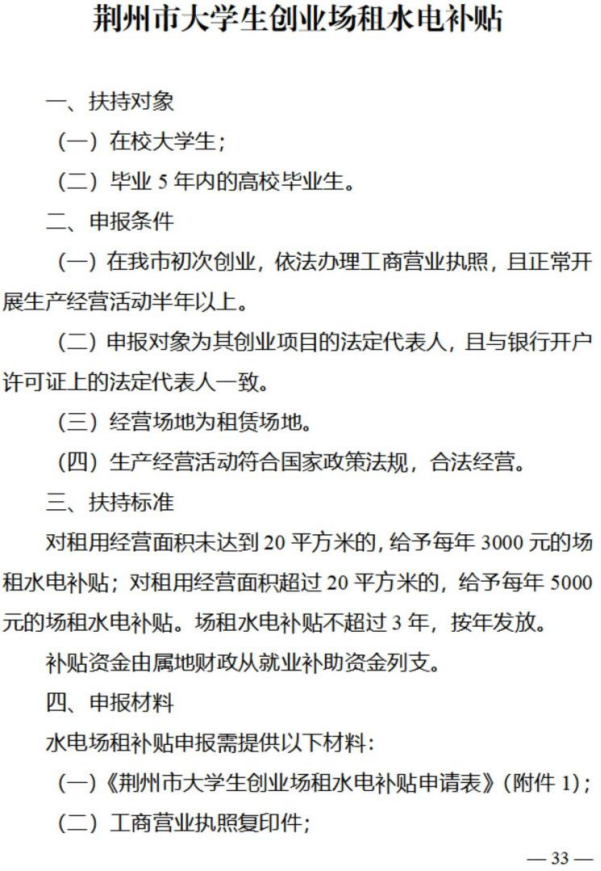 荆州市大学生创业场租水电补贴