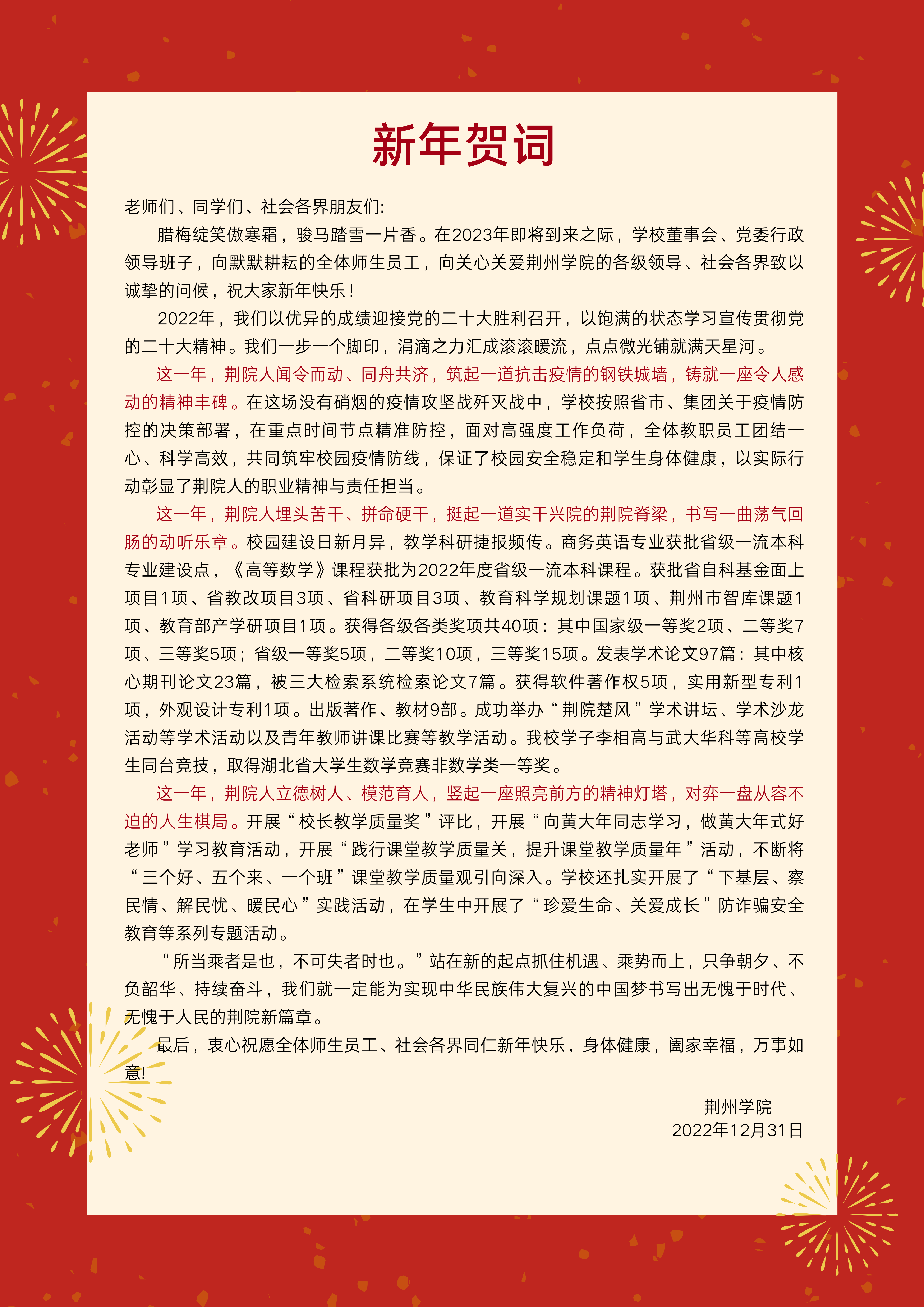 综合要闻 缤纷校园 教学科研 媒体荆院 通知公告 学术动态 【贺新年】荆州学院2023年新年贺词 来源: 编审: 审核: 签审: 日期:2022-12-31 上一篇: 【驻村帮扶】荆州学院驻村工作队12月份工作纪实:荆州学院持续开展困难群众关爱活动 下一篇: 【学校动态】校领导带队巡查寒假校园安全工作 返回列表页 最新文章 【学校动态】数智赋能谋转型 精准调研开新局—... 【访企拓岗】访企拓岗强教学,促就业——党委书... 【学校动态】副校长聂好春深入教学一线听评思... 【学校动态】以评促建谋发展 深入调研启新程—... 【专题学习】中国共产党第二十届中央委员会第... 【喜讯】我校“湖北产业教授”实现新突破