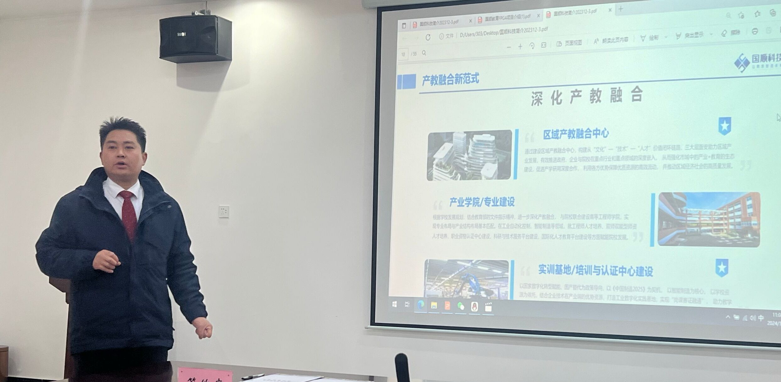 陈怀中总裁通过PPT详细介绍了国顺为汉科技公司的发展历程,分享了公司与政府、学校、行业等合作的成功案例、经验做法及取得的成效。并就智能制造、芯片技术、Ai人工智能产品系列、机器人行业与学校的合作模式作了细致的解读。