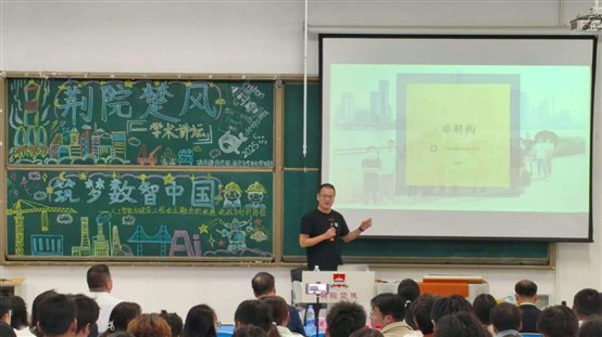 最后,戴国强校长进行总结讲话,他首先对刘经理的精彩讲座表示感谢。他希望,全校师生要从三个方面来努力:第一,紧跟时代,更新教育理念,积极将人工智能、大数据、物联网等数字技术融入建筑类专业教育全过程,着力培育兼具扎实专业基础和数字应用能力的复合型人才;第二,推动融合,强化科研攻关,加强跨学科、跨领域的合作,深化与盈建科等头部企业的校企协同,聚焦智能设计、智能建造、智慧建筑等前沿方向,推动科技创新与成果转化;第三,勇担使命,彰显青春力量。希望同学们把握时代机遇,主动学习新知识、掌握新技能,未来在“筑梦数智中国”的宏伟征程中,展现荆院学子的风采,贡献自己的青春智慧与力量。