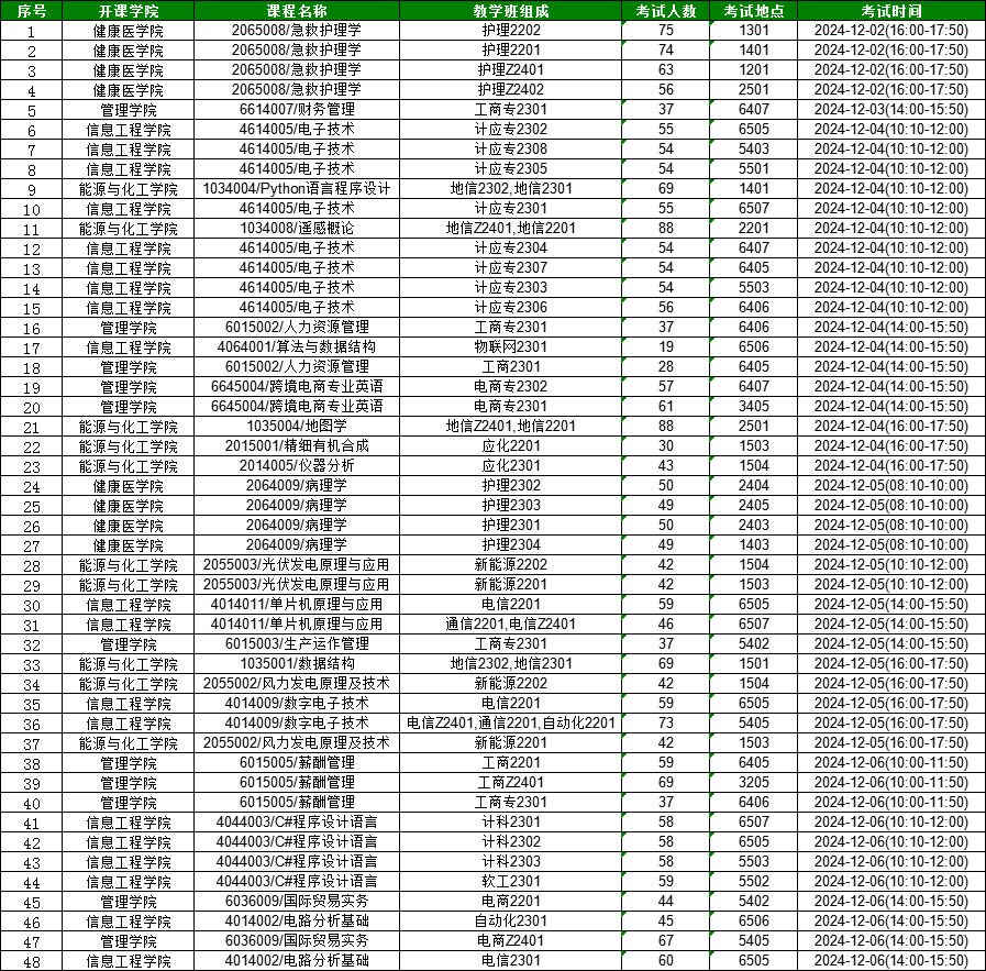 2024-2025学年第一学期期末考试安排(第14周)