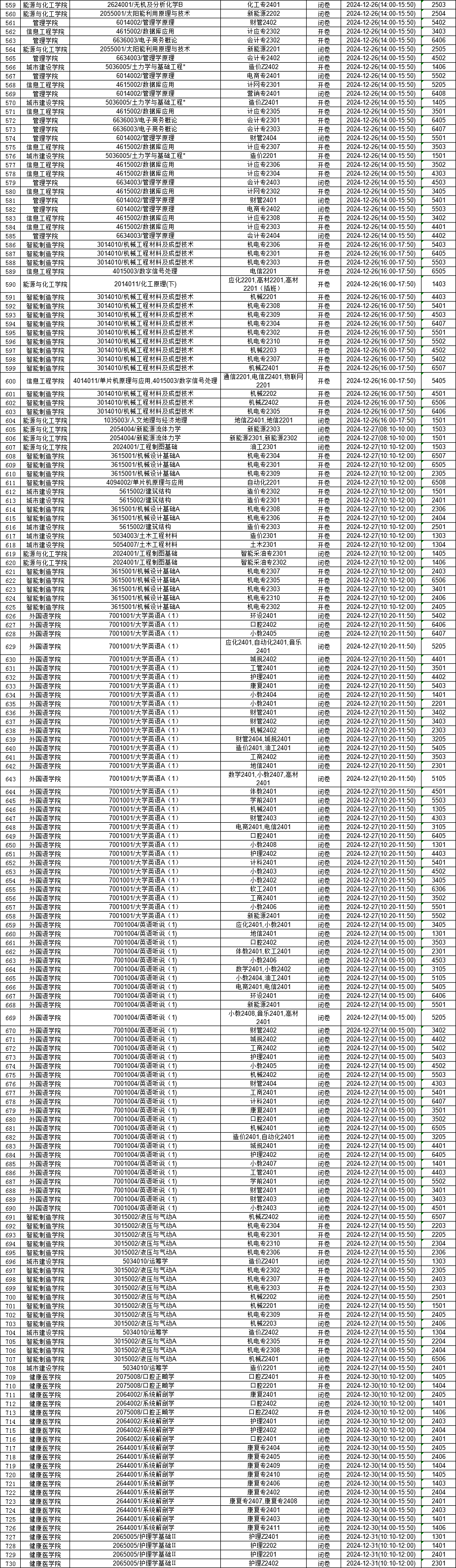 2024-2025学年第一学期期末考试安排(第17、18周)
