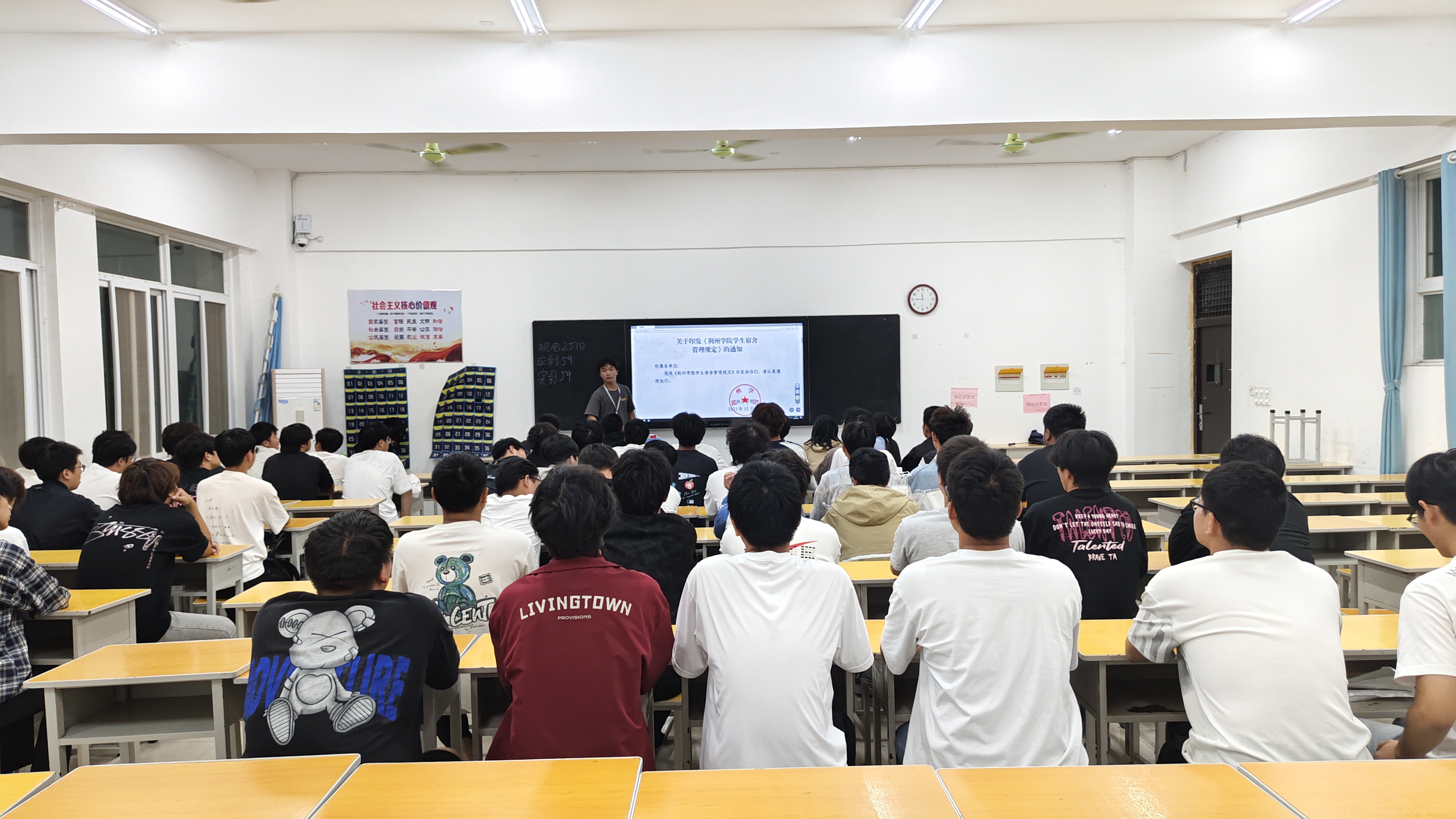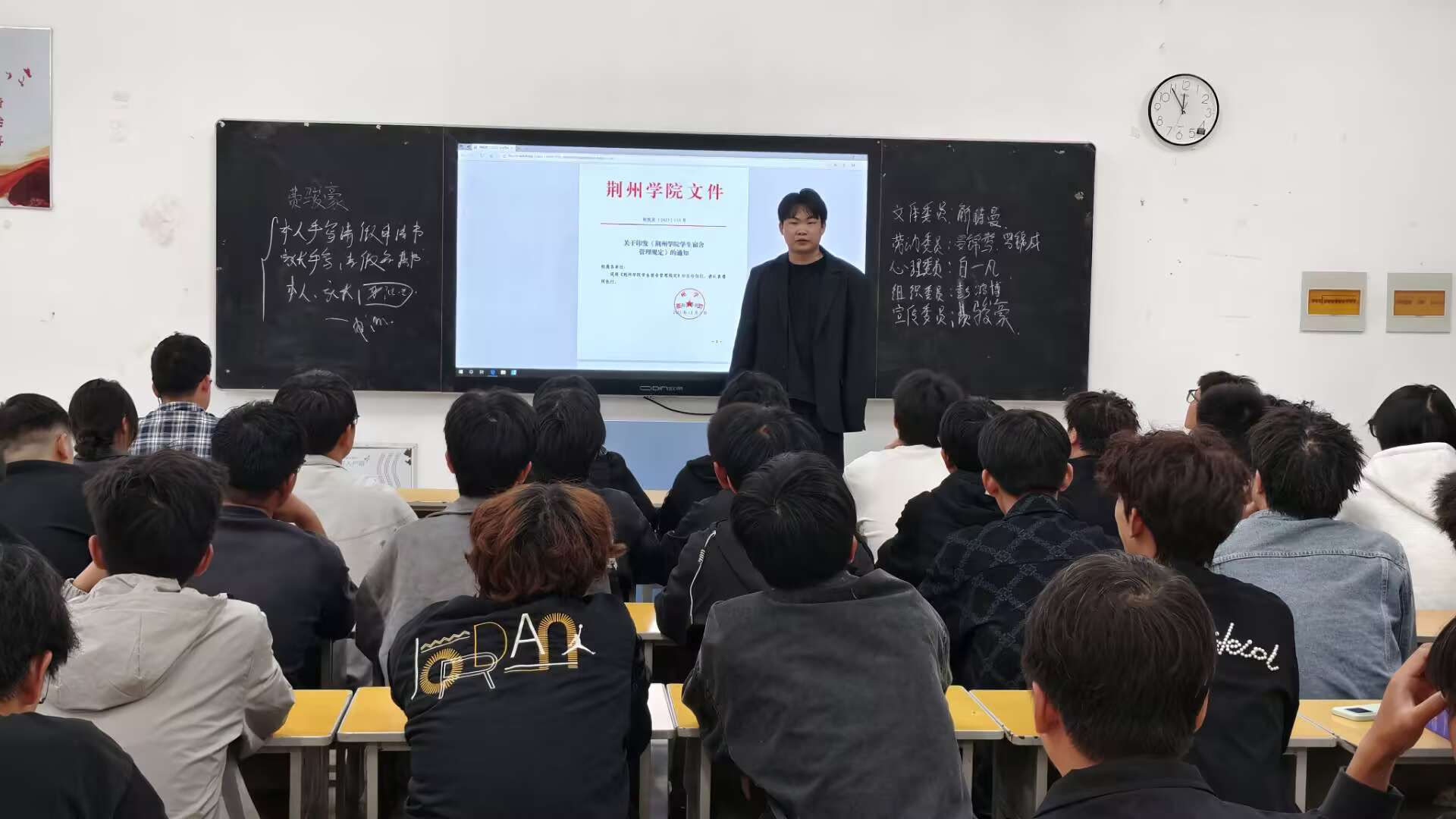 班会上,辅导员老师们围绕《荆州学院学生管理规定》《荆州学院考勤及请假管理规定》《荆州学院学生违纪处分解除规定》及《荆州学院考试违规处理办法》等一系列重要规章制度,组织了系统学习。结合学生日常管理和往届典型案例,辅导员对课堂考勤、请销假流程、宿舍行为规范、考试纪律等关键条款进行了重点解读与说明,引导学生深刻理解规定的制定初衷与具体要求。