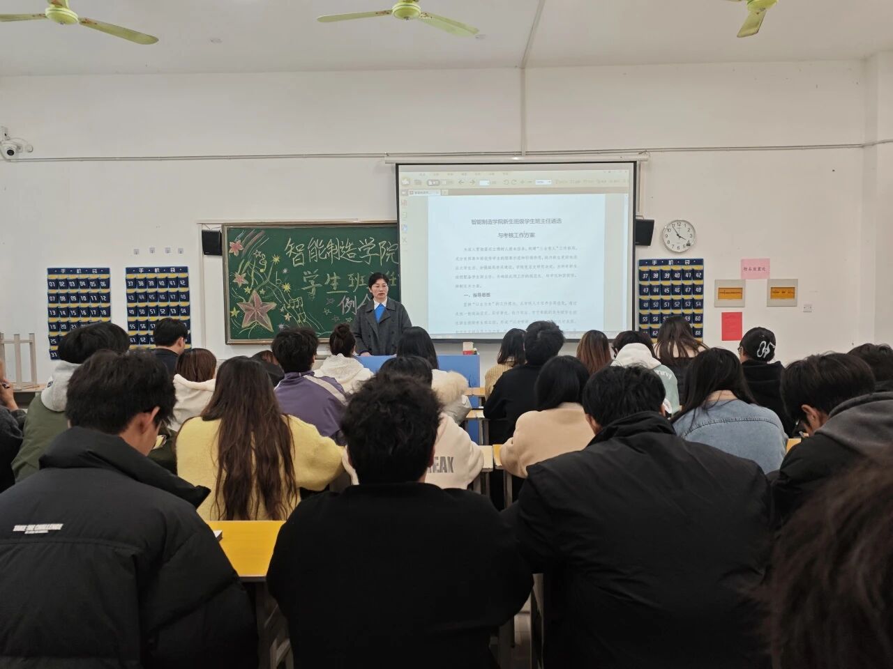 为筑牢新生班级管理根基,打造优质朋辈引领队伍,11月21日下午4点,智能制造学院于6206教室召开新生班级学生班主任工作部署会。学院党总支书记王艳担任主讲,全体新生辅导员、学生班主任参会,围绕《智能制造学院新生班级学生班主任遴选与考核工作方案》,系统学习职责要求、选拔机制与考核标准,为新生育人工作谋篇布局。