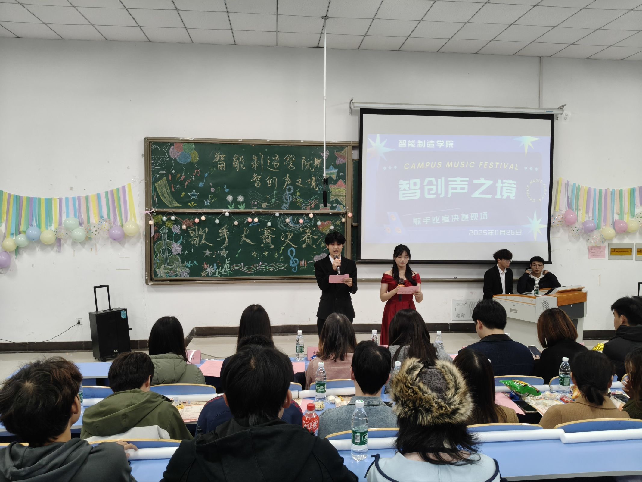 本网讯(通讯员 晏学渊)歌声激荡青春,旋律点亮梦想。11月26日晚6:30,智能制造学院“智创声之境”校园歌手大赛决赛在3405教室精彩上演。本次活动以音乐为载体,生动展现了学院学子蓬勃向上的精神风貌,吸引了广大师生线上线下同步关注,现场座无虚席,掌声与喝彩交织成一场青春的听觉盛宴。