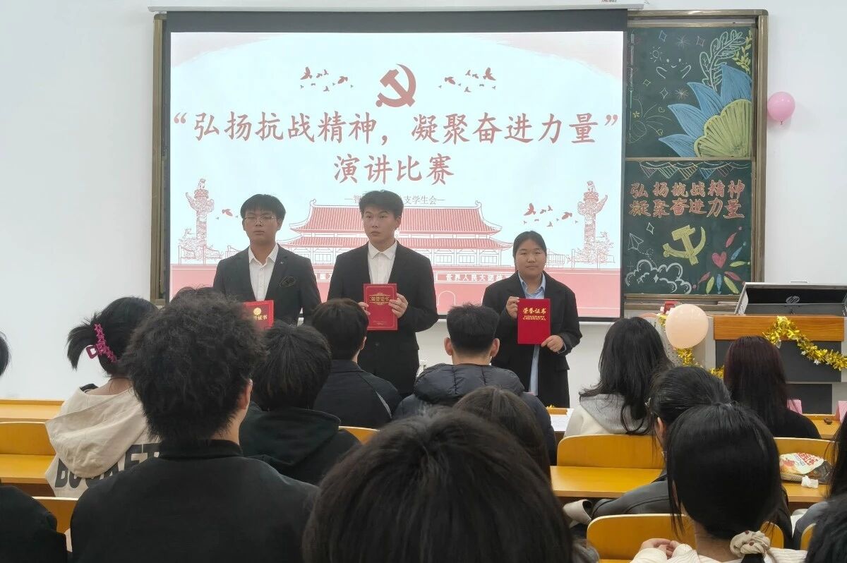 活动尾声进行了颁奖仪式。经过前期评选,本次“抗战精神与我”主题演讲比赛共产生三名获奖者:一等奖肖尧方、二等奖雷雨轩、三等奖谭小康。学院学生会为获奖同学颁发了荣誉证书及奖品。