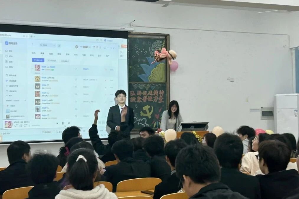 为增强活动互动性与感染力,现场特别设置了“击鼓传花”环节。在《好运来》的欢快旋律中,玩偶于同学们手中传递。音乐随机暂停时,手持玩偶的同学主动上台,深情献唱《军中绿花》《我和我的祖国》等爱国歌曲。现场师生自发跟唱,在轻松热烈的氛围中,爱国情怀深入人心。