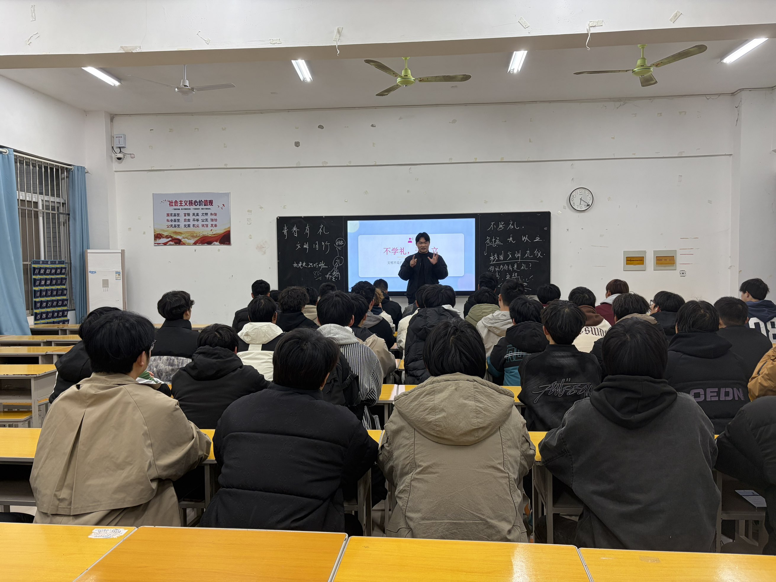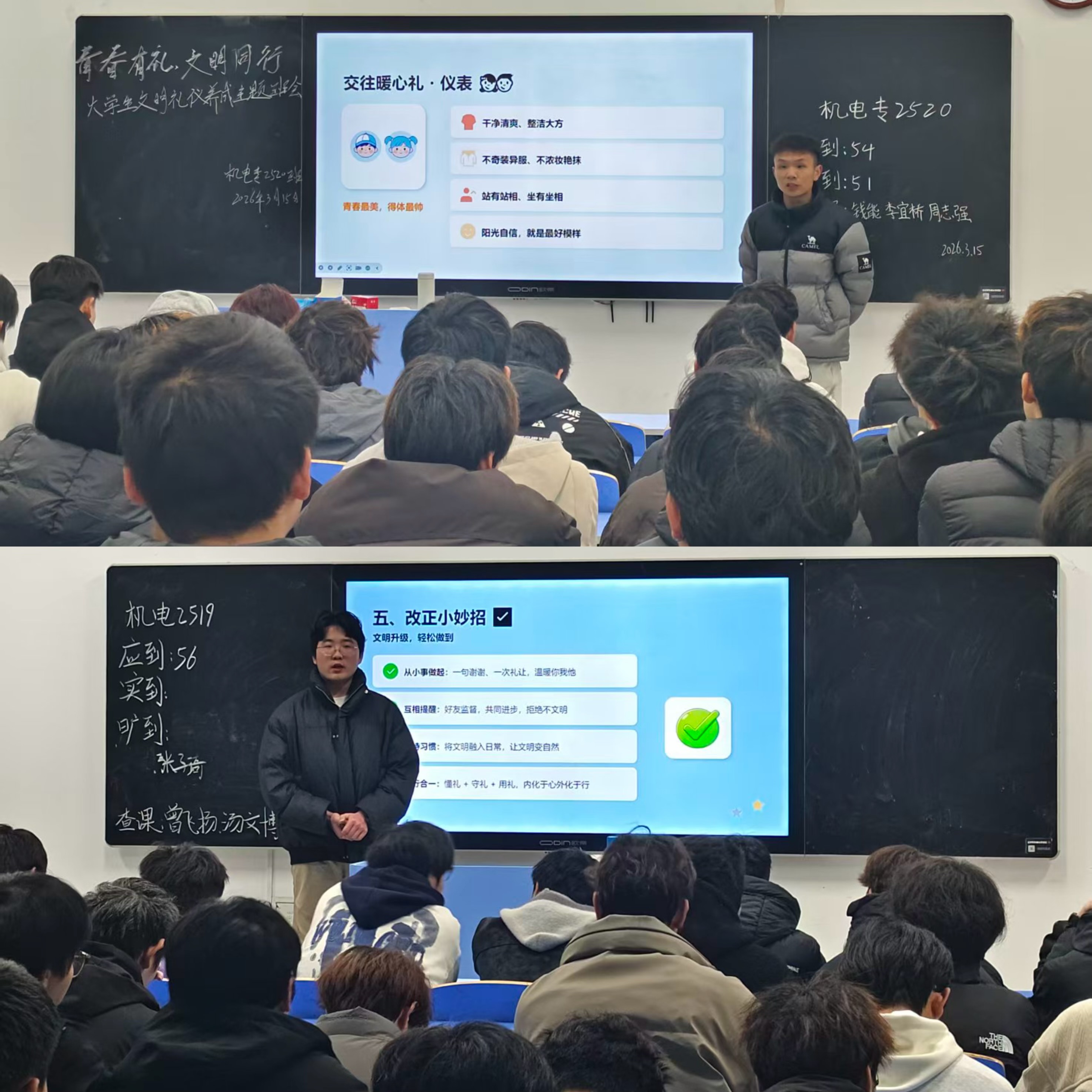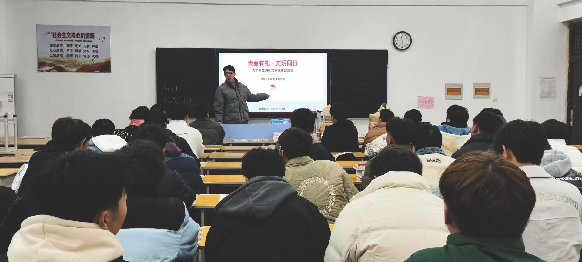 在班会过程中,辅导员们结合学院特色,运用鲜活案例深入浅出地讲解了礼仪规范。在课堂礼仪部分,重点强调了按时上课、专注听讲、尊重教师等基本要求;在校园文明方面,引导学生自觉维护环境卫生、遵守公共秩序,共建文明校园;在人际交往与公共文明环节,辅导员通过实例指导学生掌握礼貌用语与待人接物的技巧,做到言行得体、举止文雅。