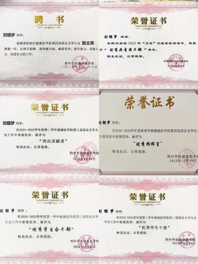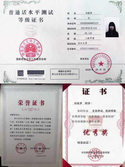 学习方面:追寻着最初幻想的轨迹,她仍努力地在苦学这条道路上前行,几乎将自己每一天都置身在学习工作当中,虽然大学期间她不是班内的班委,但她也没有懈怠,不断努力进取,在大一上半册学期末综测分排名5/66;大一下半册学期末综测分排名3/77;大二两学期期末均在2/77,在2023-2025年两年都评为“优秀学生干部”;在荆州学院第十四届学研杯主题教育活动中荣获“优秀奖”;在荆州学院“助力高考,梦想启航”视频征集活动中,评为“优秀个人”;在荆州学院“我为无烟校园代言”短视频征集,荣获“优秀宣传个人”;在毕业季视频剪辑拍摄中,被评为“活动积极分子;”在荆州学院“光影荆院·青春校园”抖音短视频大赛荣获“优秀奖”;协团队在“五四精神,传承有我”宣传作品中荣获“二等奖”;在荆州学院2025年“五四”总结表彰活动中,被授予“优秀共青团干部”称号;在老师指导下,协团队在防范非法金融活动短视频大赛中,荣获“优秀作品奖”。在大学三年内她不断在在视频剪辑中创新,宣传我校积极向上的面貌。
