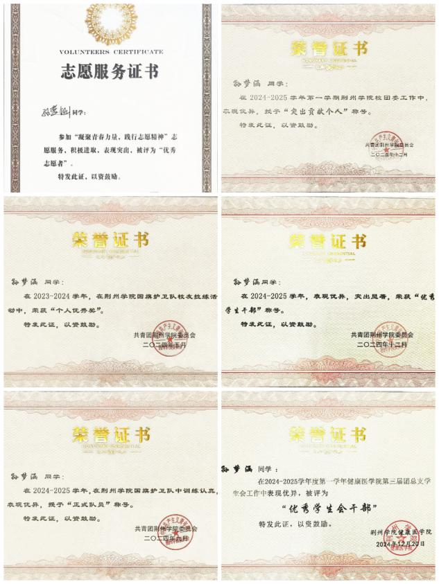 实践上,积极响应组织号召,持续投身社会实践,共参与志愿服务活动60余次,累计志愿服务时长200余小时,努力践行“奉献、友爱、互助、进步”的志愿精神,在校内曾参加清明节烈士陵园扫墓、协助社区开展全民运动会及迎端午活动,以及支持社区卫生院的爱心义诊等多项志愿服务;校外加入了荆州市红十字会青年志愿服务总队,参与了荆州市马拉松赛事志愿服务,并在家乡积极协助社区整理档案、粘贴宣传标语等志愿工作中贡献力量。通过这些经历,她不断锤炼自身品格,增强服务意识,并有幸荣获“优秀志愿者”称号。