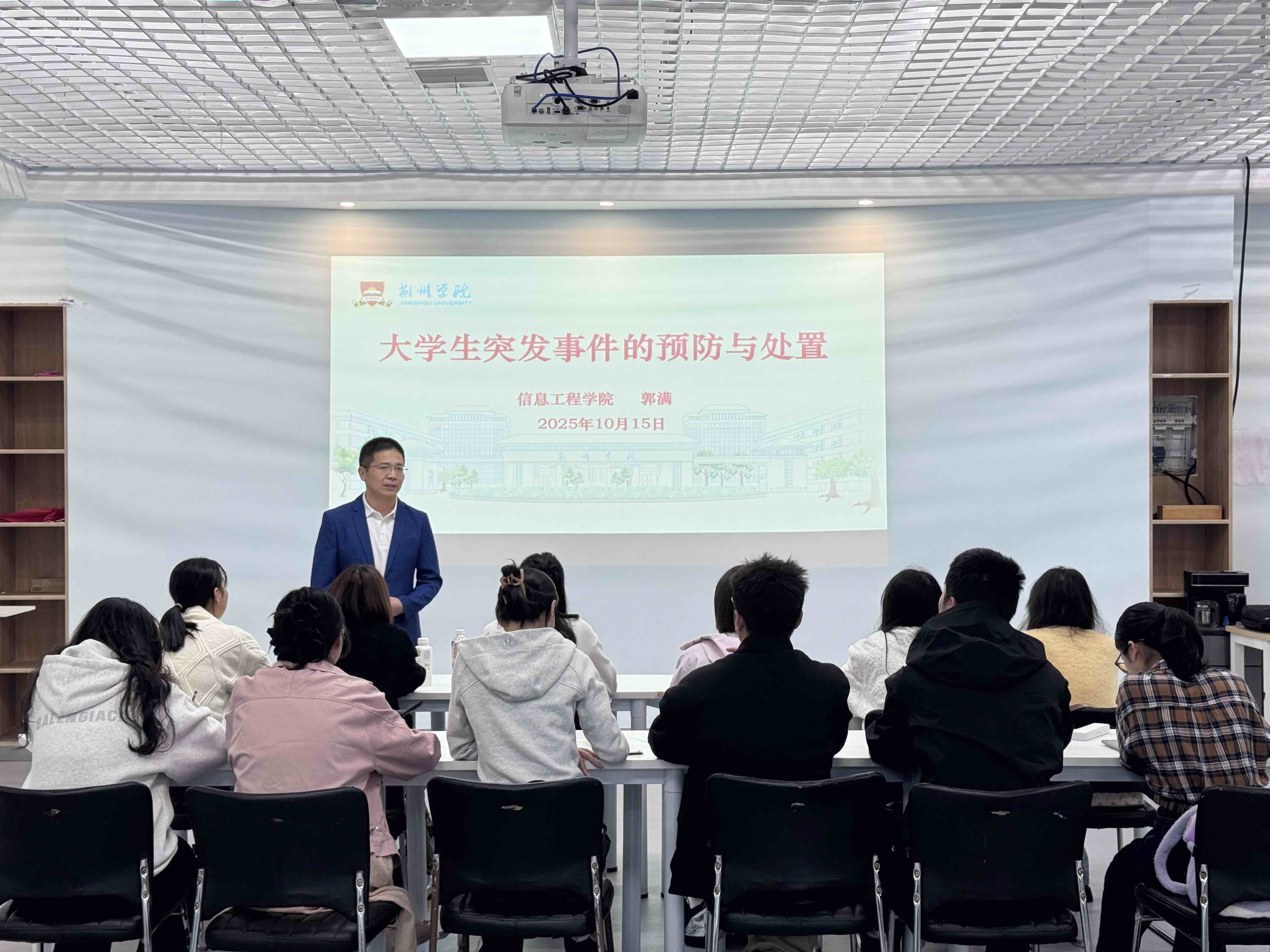 信息工程学院党总支副书记郭满以《大学生突发事件的预防与处置》为题,系统梳理了大学生突发事件的定义、特点与常见类型,并结合实际案例详细讲解了预防机制与应急处置流程。他强调,辅导员在日常工作中要牢固树立安全意识,做到“人头清晰、制度健全、文化引领”,建立健全“宿舍—班级—学院—学校”四级预警机制,提升对突发事件的敏锐度与响应能力。