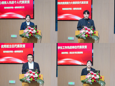 在先进代表发言环节,心理育人先进个人、城市建设学院辅导员贾文文,辅导员素质能力大赛获奖代表、智能制造学院辅导员吴昙,优秀班主任代表、城市建设学院教师胡彦龙,以及学生工作先进单位代表、教育学院党总支书记莫修梅依次分享工作经验和育人感悟,生动展现了我校学工队伍的责任担当与育人情怀。