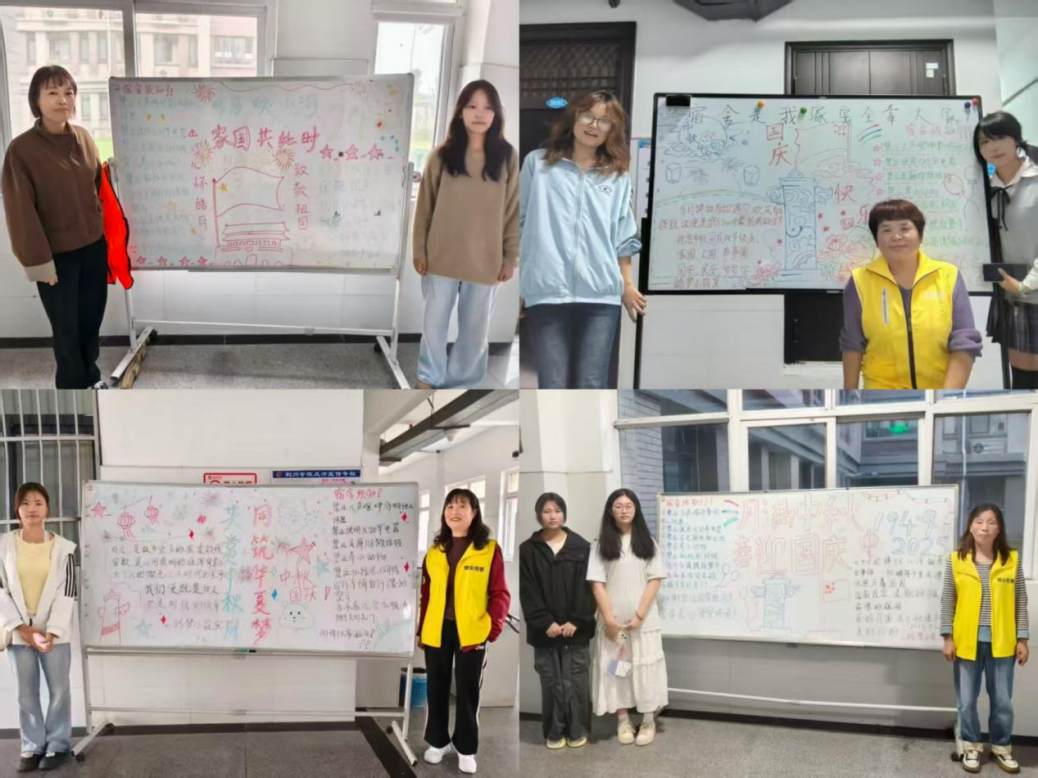 绘制期间,鸽梦小筑成员分工协作,两人一组深入各宿舍楼开展创作。板报设计巧妙融合国庆与中秋元素,既有华表、天安门等象征国家繁荣昌盛的图案,也融入了明月、玉兔、桂花、月饼等传递团圆与祝福的意象,图文并茂地诠释了“爱国爱家、同心筑梦”的深刻内涵。